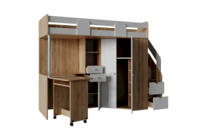 Шкаф для одежды и штанга для белья обеспечивают отличную возможность держать вещи в порядке. Ящики и полки дополняют картину, предоставляя достаточно пространства для мелочей, книг или игрушек. Благодаря открытым полкам найти нужное становится проще простого — особенно для ребёнка.